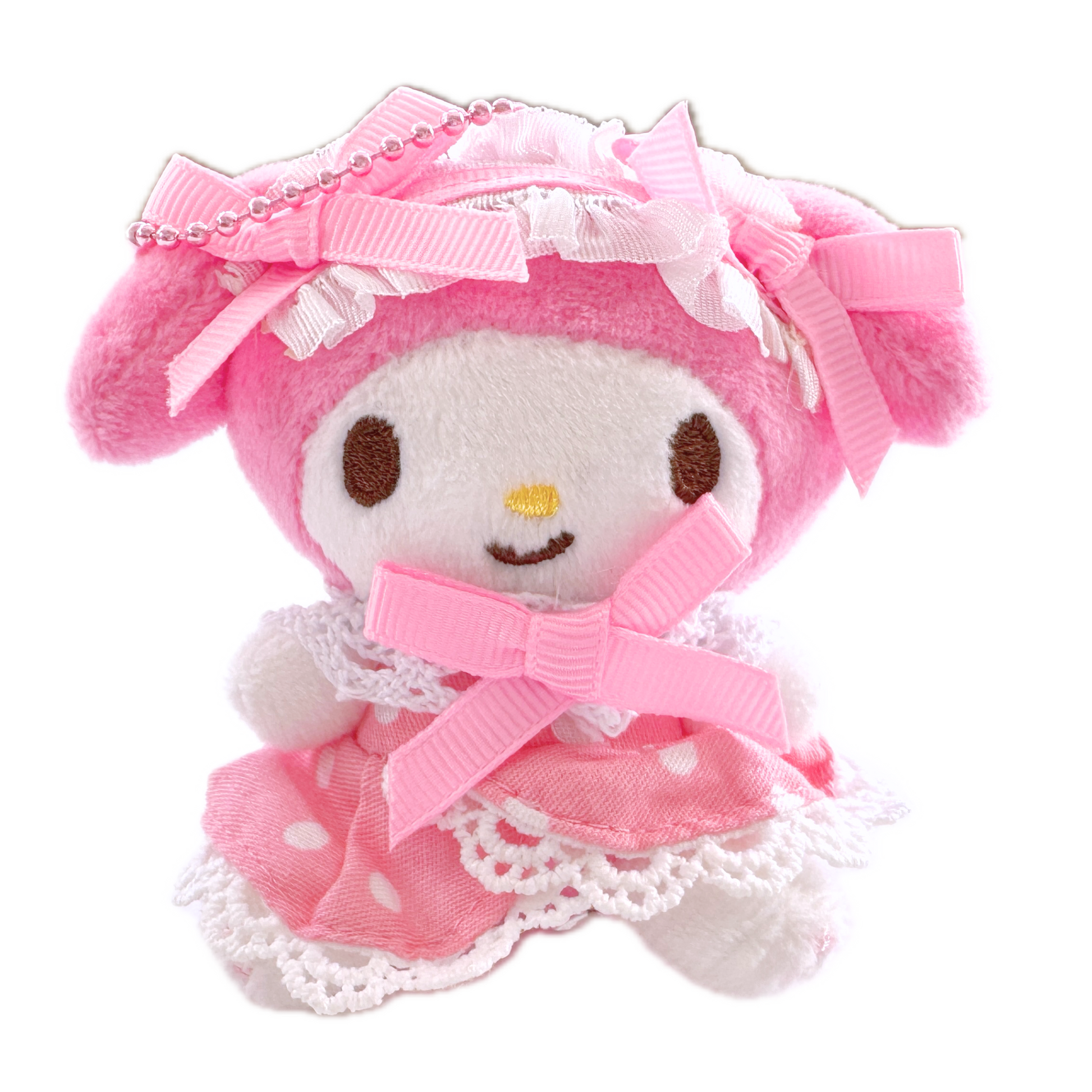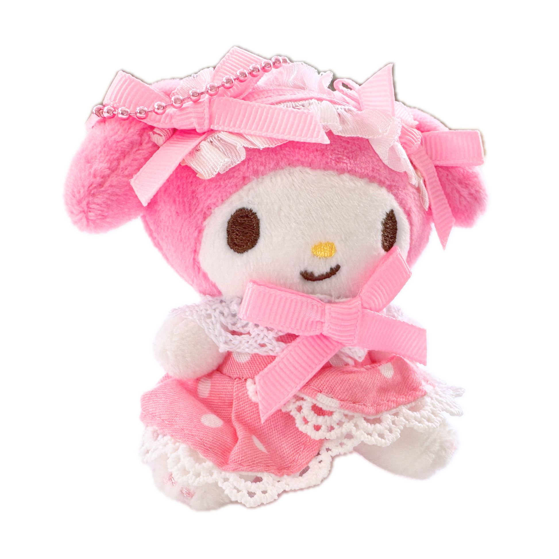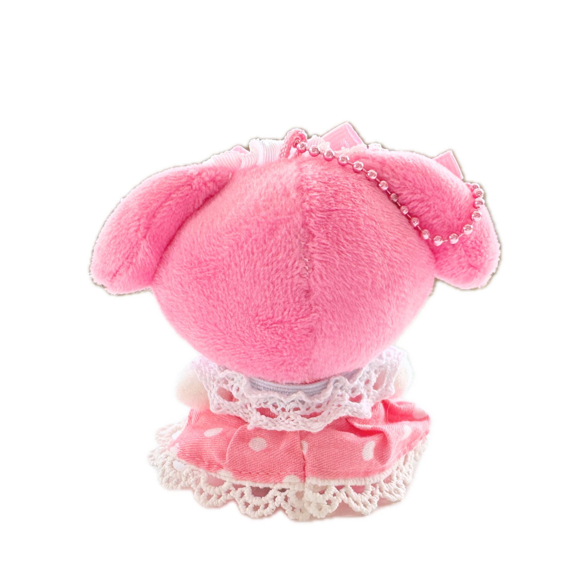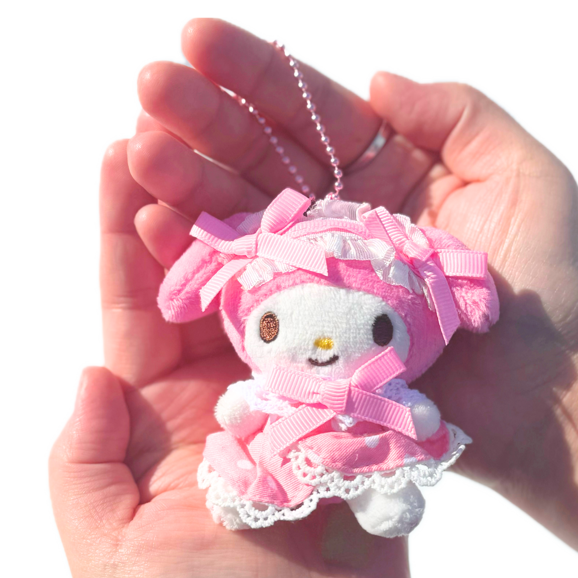 Mini My Melody plush charm, dressed in a sweet pink polka-dot maid dress with delicate lace trimmings and ribbon bows. This Sanrio keychain is perfect for fans of Lolita fashion, J-fashion, and vintage-inspired aesthetics.Featuring a soft plush design, this charm can easily clip onto your handbag, backpack, or keys using the attached ball chain.